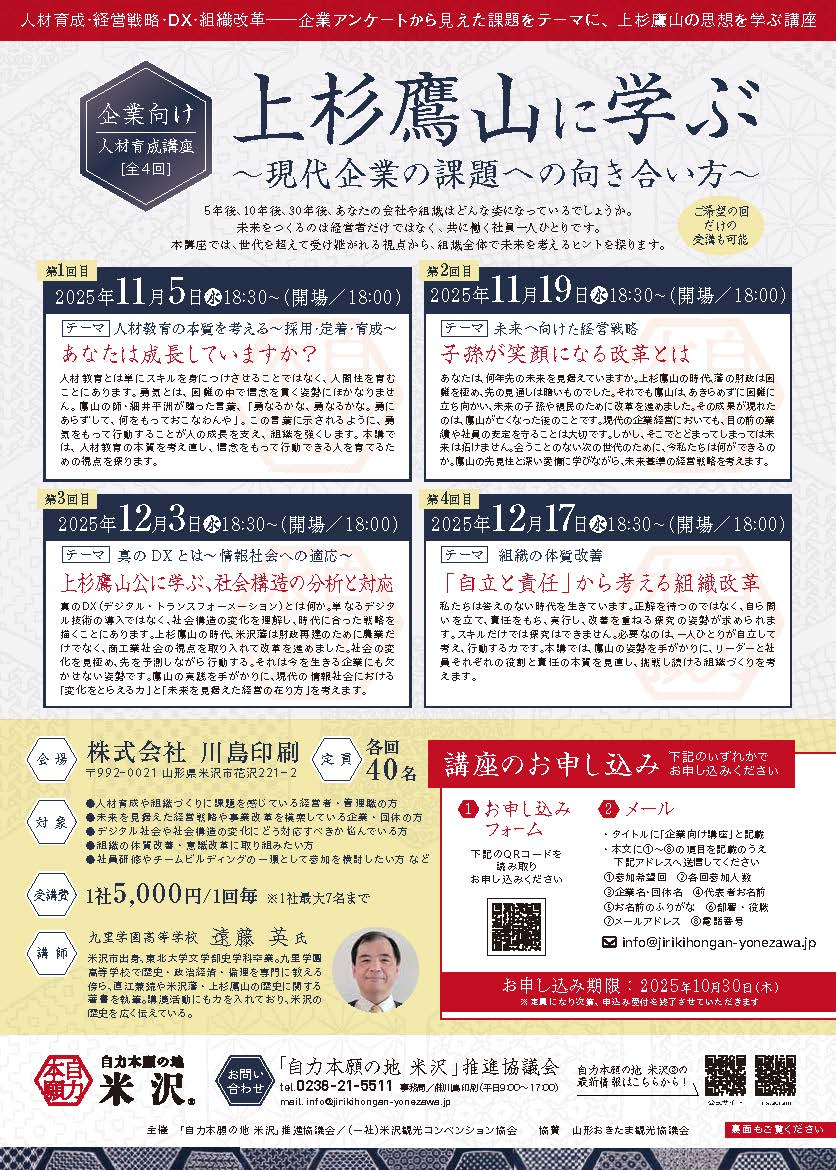 講座名 | 企業向け人材育成講座 [全4回] 上杉鷹山に学ぶ ~現代企業の課題への向き合い方~ |